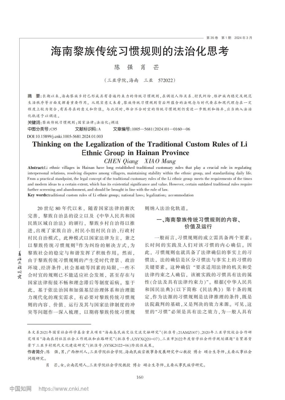 陳強(qiáng)教授、肖芒教授合作的論文《海南黎族傳統(tǒng)習(xí)慣規(guī)則的法治化思考》發(fā)表在《青海民族研究》2024年第1期。該成果聚焦海南黎族傳統(tǒng)習(xí)慣規(guī)則的法治化路徑,具有一定的社會(huì)影響。學(xué)術(shù)層面,進(jìn)一步豐富了民族習(xí)慣法在地方法治建設(shè)中系統(tǒng)性研究的成果,為多民族地區(qū)法治實(shí)踐提供理論參照。社會(huì)層面,推動(dòng)黎族文化保護(hù)與現(xiàn)代法治的有機(jī)融合,既維護(hù)少數(shù)民族文化傳承,又增強(qiáng)基層社會(huì)治理的包容性。政策層面,為海南自貿(mào)港建設(shè)中的民族事務(wù)治理創(chuàng)新提供思路,促進(jìn)國(guó)家法與民族習(xí)慣法的良性互動(dòng)。實(shí)踐層面,助力地方立法吸納傳統(tǒng)規(guī)則中的生態(tài)保護(hù)、糾紛調(diào)解等有益元素,提升民族地區(qū)法治認(rèn)同,對(duì)維護(hù)民族團(tuán)結(jié)、推進(jìn)鄉(xiāng)村振興具有現(xiàn)實(shí)意義。文章發(fā)表后,海南民族宗教事務(wù)發(fā)展研究中心官網(wǎng)將其收錄于“民族習(xí)慣法研究”專(zhuān)題成果目錄中,作為海南黎族法治化研究的代表性文獻(xiàn)進(jìn)行推廣。