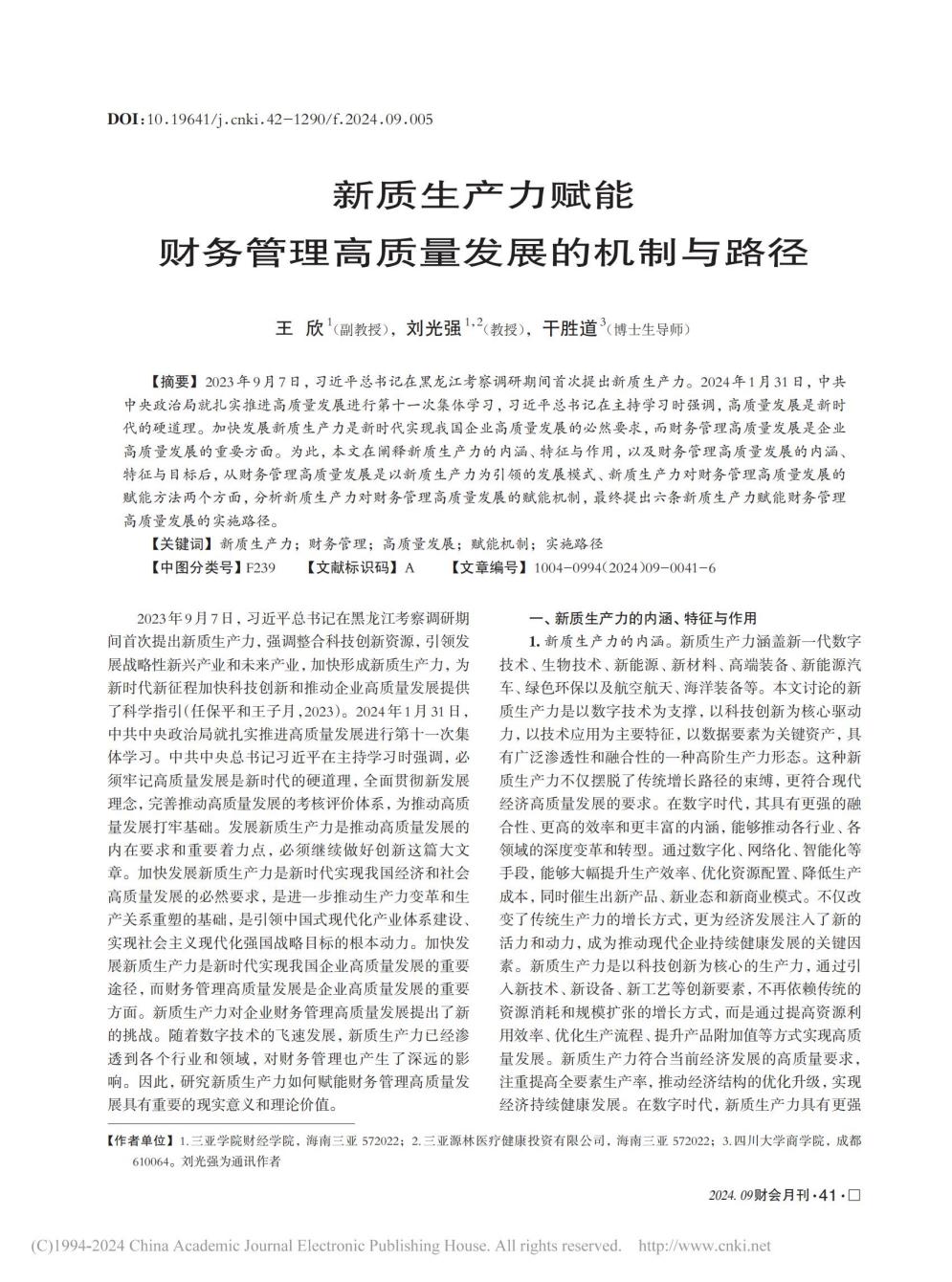 王欣教授、劉光強(qiáng)教授等合作的論文《新質(zhì)生產(chǎn)力賦能財(cái)務(wù)管理高質(zhì)量發(fā)展的機(jī)制與路徑》發(fā)表于《財(cái)會(huì)月刊》2024年第9期。文章深入探討了新質(zhì)生產(chǎn)力賦能財(cái)務(wù)管理高質(zhì)量發(fā)展的機(jī)制與路徑,提出了六條新質(zhì)生產(chǎn)力賦能財(cái)務(wù)管理高質(zhì)量發(fā)展的實(shí)施路徑:構(gòu)建數(shù)字化財(cái)務(wù)管理系統(tǒng)、優(yōu)化財(cái)務(wù)管理流程、加強(qiáng)財(cái)務(wù)風(fēng)險(xiǎn)管理、推動(dòng)業(yè)財(cái)一體化深度融合、培養(yǎng)數(shù)字化財(cái)務(wù)管理人才和持續(xù)創(chuàng)新財(cái)務(wù)管理模式。文章發(fā)表后被中國(guó)人民大學(xué)書(shū)報(bào)資料中心復(fù)印報(bào)刊資料《財(cái)會(huì)文摘》2024年05期收錄為文摘。