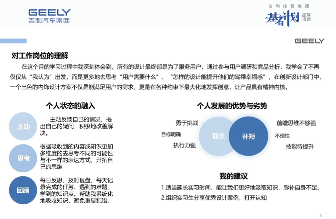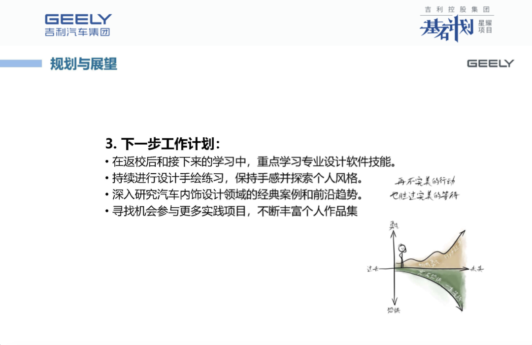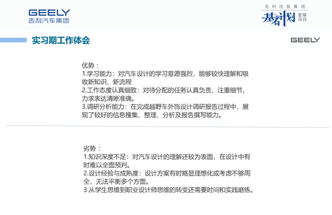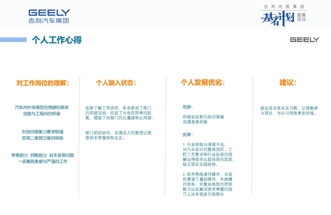 這次實(shí)習(xí)讓我接觸到真實(shí)項目,與一線設(shè)計師交流,深刻體會到設(shè)計是始于問題、忠于落地、將創(chuàng)意轉(zhuǎn)化為產(chǎn)品的過程。我認(rèn)識到自身不足,未來將繼續(xù)深入學(xué)習(xí),提升設(shè)計認(rèn)知與技能,為成為一名合格汽車設(shè)計師并加入吉利不斷努力。