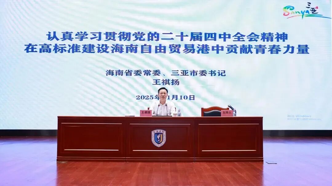 11月10日,省委常委、市委書記王祺揚(yáng)以“認(rèn)真學(xué)習(xí)貫徹黨的二十屆四中全會(huì)精神,在高標(biāo)準(zhǔn)建設(shè)海南自由貿(mào)易港中貢獻(xiàn)青春力量”為題,在三亞學(xué)院宣講黨的二十屆四中全會(huì)精神并講授思政課。