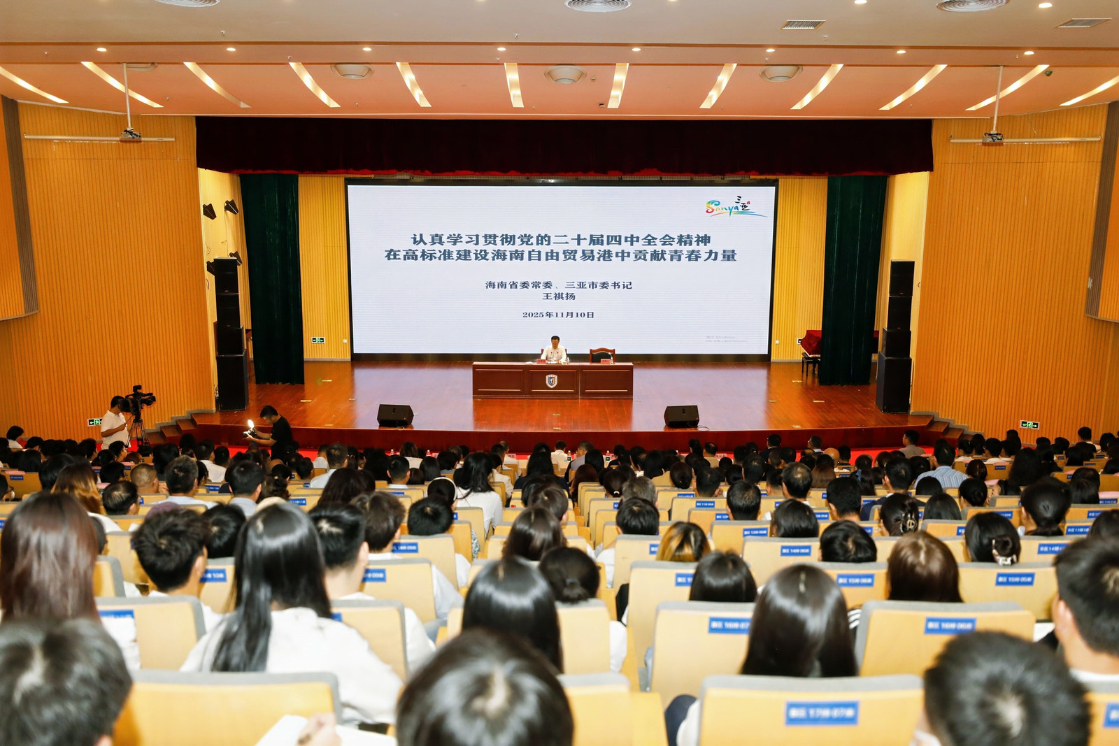 11月10日,省委常委、市委書記王祺揚以“認真學習貫徹黨的二十屆四中全會精神,在高標準建設海南自由貿易港中貢獻青春力量”為題,在三亞學院宣講黨的二十屆四中全會精神并講授思政課。三亞學院校長沈建勇主持宣講會。