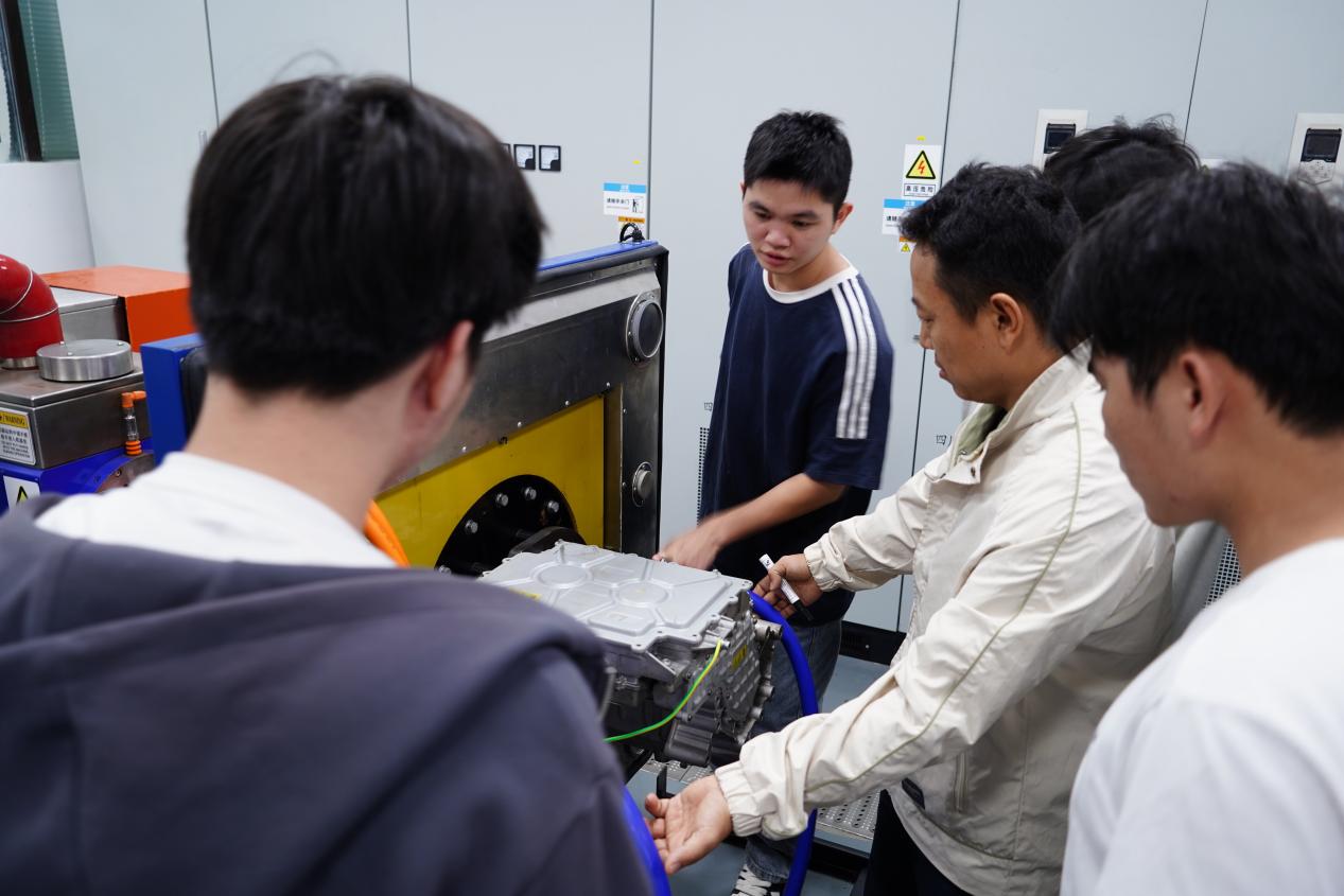 在吉利新能源與智能汽車產(chǎn)業(yè)學院的驅(qū)動電機測試實驗室,王良成老師正帶著學生調(diào)試測功機臺架。這里的核心測件由吉利提供,學校配套專業(yè)測試儀器,形成“校企資源互補”的實驗條件,讓學生直面產(chǎn)業(yè)真實設備。