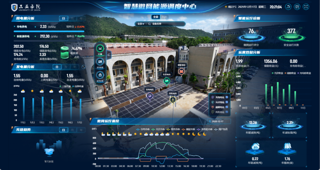 在零碳能源實驗室,謝瓊丹老師的項目團隊正忙著驗證綠色甲醇催化劑的催化效果。從光伏板收集綠色電能,到電解水制氫,再到甲醇合成反應,學生們?nèi)虆⑴c“零碳甲醇”的全鏈條研發(fā)。實驗室隔壁的智慧微網(wǎng)能源調(diào)度中心,實時顯示著光伏供電、儲能充放電、碳減排量等數(shù)據(jù),212.30WZ的新能源供電量較昨日提升70.67%,直觀呈現(xiàn)項目的環(huán)保成效。