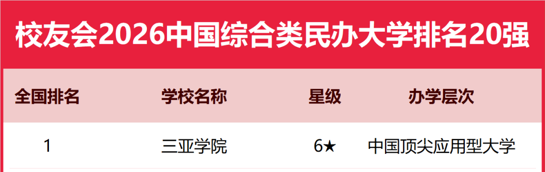 在備受關(guān)注的 “2026中國綜合類民辦大學(xué)排名(應(yīng)用型)” 榜單中,三亞學(xué)院成功問鼎,榮登應(yīng)用型民辦大學(xué)全國第一寶座,成為培養(yǎng)高素質(zhì)應(yīng)用型人才的典范高校!