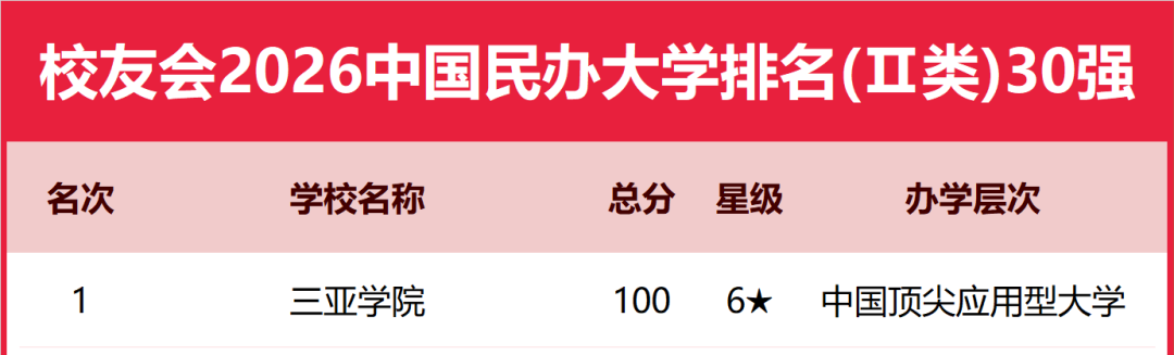 喜訊傳來,捷報雙至!在最新發(fā)布的全國第三方大學(xué)評價研究機構(gòu)艾瑞深校友會網(wǎng)2026校友會中國大學(xué)排名中,三亞學(xué)院以卓越實力強勢登頂,一舉斬獲“民辦大學(xué)(Ⅱ類)”“應(yīng)用型民辦大學(xué)”兩項全國首位,以硬核實力領(lǐng)跑榜單,樹立應(yīng)用型民辦高校標桿!