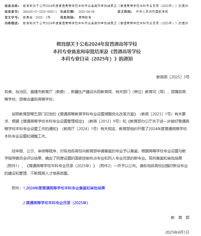2025年4月,教育部公布了2024年度普通高等學(xué)校本科專業(yè)備案和審批結(jié)果,三亞學(xué)院申報(bào)的儲(chǔ)能科學(xué)與工程、時(shí)尚傳播、電子競(jìng)技運(yùn)動(dòng)與管理3個(gè)本科專業(yè)通過教育部備案和審批。