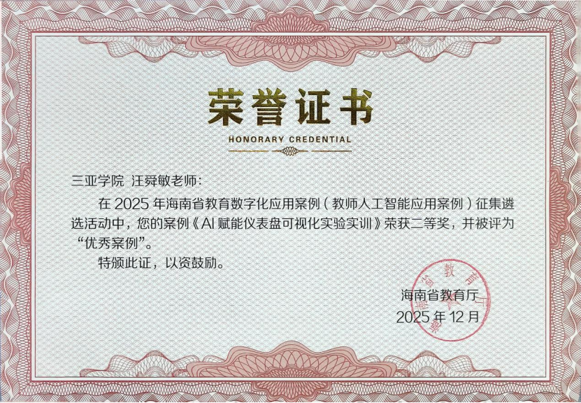 日前,海南省教育廳2025年教育數(shù)字化應(yīng)用案例征集遴選結(jié)果公布,信息與智能工程學(xué)院汪舜敏老師的《AI賦能儀表盤可視化實驗實訓(xùn)》案例獲教師人工智能應(yīng)用類省級二等獎,獲評優(yōu)秀案例。